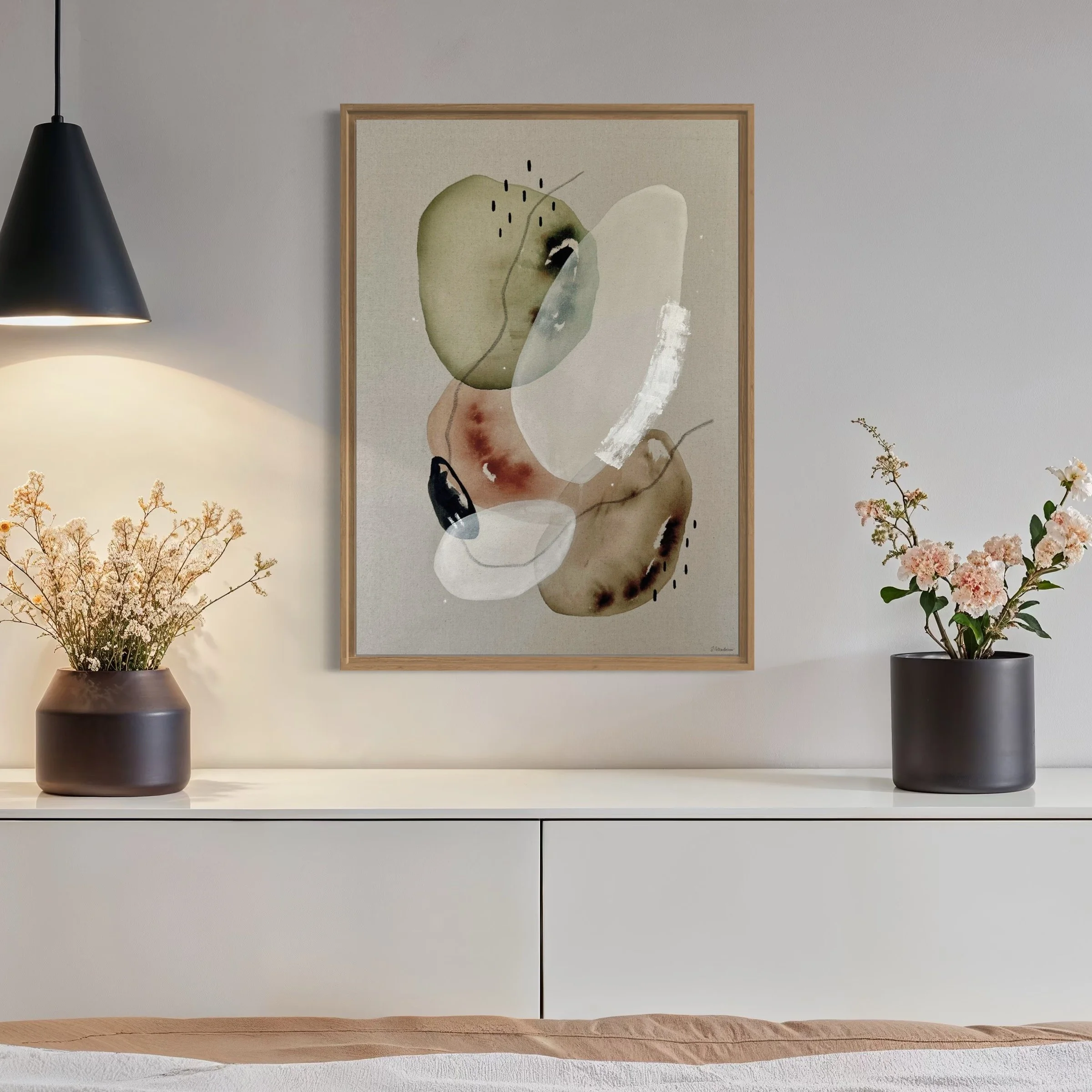 Gemalt auf einer sorgfältig gespannten Baumwoll-Leinwand, präsentiert sich das Werk auf einem stabilen, dabei außergewöhnlich leichten Abachi-Holzrahmen – naturbelassen, edel und in seiner Zurückhaltung perfekt auf das Werk abgestimmt.